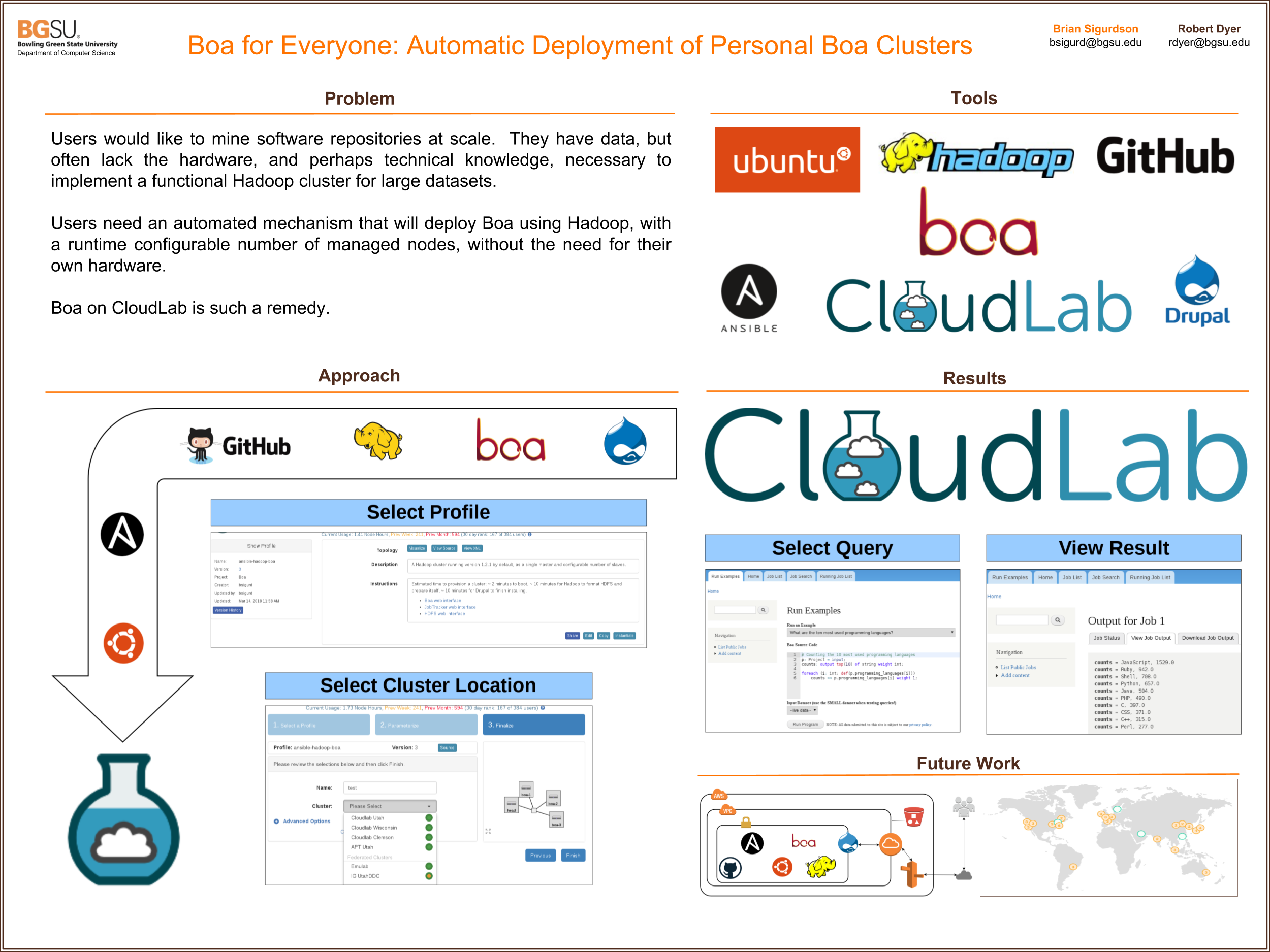 For my master’s project, I utilized Ansible and Bash to automate the deployment of a dynamically sized Hadoop cluster running Boa on CloudLab.us (a private cloud service). Upon completion, the user had a functional Boa cluster using Hadoop, running in a private cloud, using Ubuntu, Apache HTTP Server, and MySQL, with a Drupal user interface.